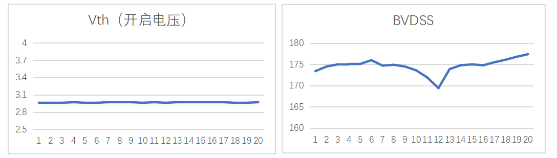 2、MOS耐壓設計余量不足,為了追求極致內阻,BVDSS余量偏低。通過上述數據可以看出,APM通過優化工藝,可以有效實現將開啟電壓一致性控制在0.2V一個檔位,滿足客戶超過6管的應用電路,最高可以滿足10個一組合計6組并聯使用。
